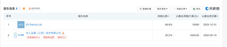 新公司由高合汽车母公司华人运通(江苏)技术有限公司(以下简称“华人运通”)持股30.2%,黎巴嫩初创公司EV Electra Ltd.持股69.8%。