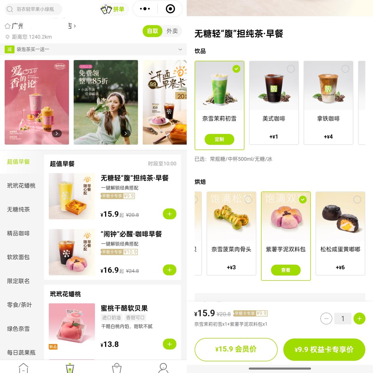 5月21日早间,红星资本局在奈雪的茶小程序看到(以广州天河中汇广场店为例),若不开通早餐卡,曾经售价9.9元的“中杯茉莉初雪+紫薯芋泥双料包/厚切岩烧乳酪吐司”现在要15.9元,曾经售价12.9元的“中杯茉莉初雪+菠菜肉骨头”现在要17.9元,曾经售价13.9元的“中杯茉莉初雪+松松咸蛋黄嘟嘟”现在要19.9元。