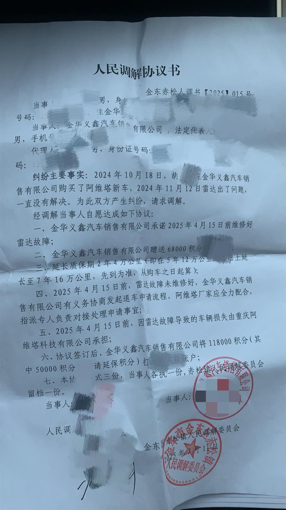 从2024年11月29日起,胡先生的车辆多次进店检测,厂家告诉他是系统问题,并承诺通过OTA升级解决。然而半年时间过去,问题依然没得到解决。今年3月,在金东区赤松镇人民调解委员会的调解下,胡先生与阿维塔门店签订了协议书。协议书中明确:1. 金华义鑫汽车销售公司(销售门店)承诺2025年4月15日前维修好雷达故障;2. 若4月15日前仍未修复问题,金华义鑫汽车销售有限公司有义务发起退车申请流程,阿维塔厂家应全力配合,指派专人负责对接处理申请流程。