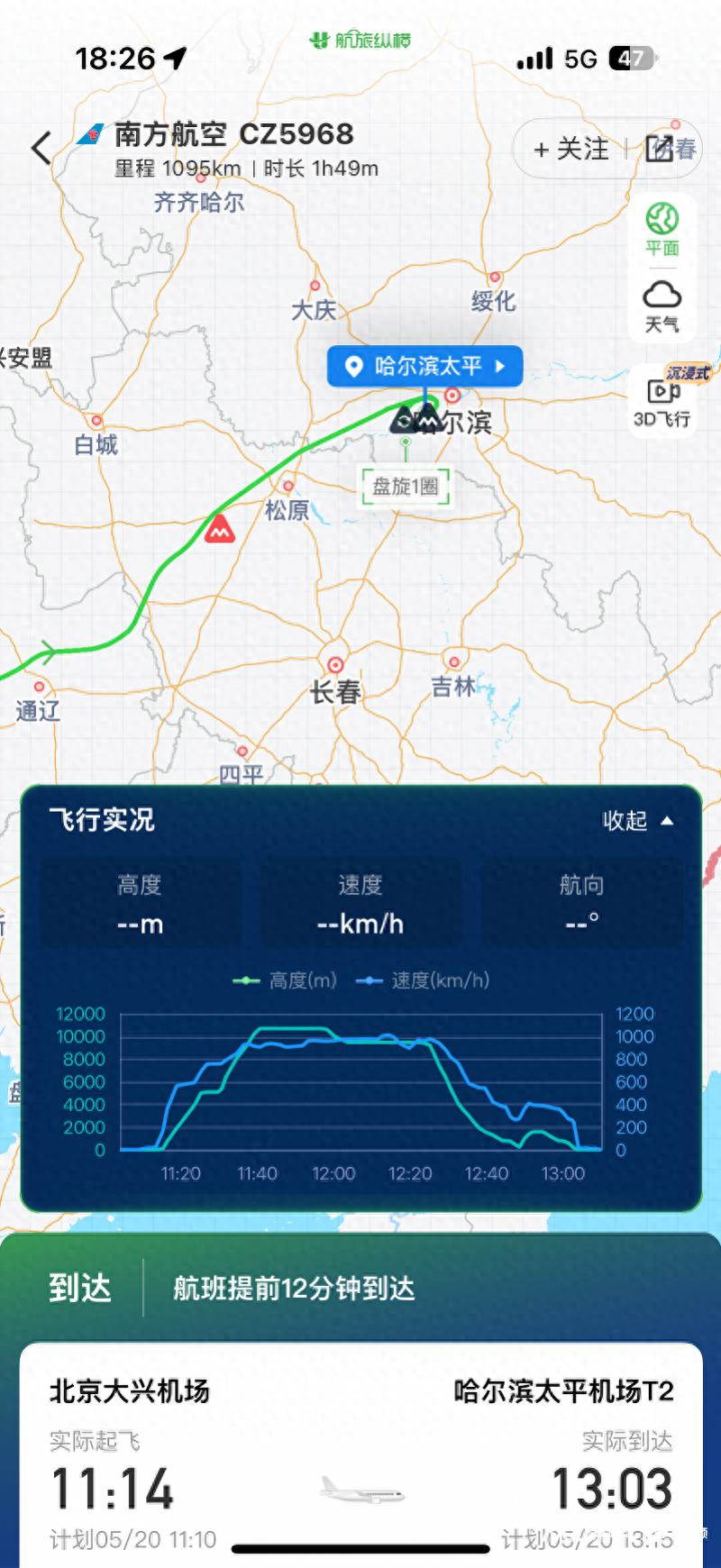 据航旅纵横信息显示,该航班于5月20日11时14分从北京大兴机场起飞,13时03分到达哈尔滨太平机场,比计划还提早了13分钟。第一次降落前发生6次重度颠簸、2次中度颠簸、1次轻度颠簸,触地复飞后发生1次中度颠簸,在机场盘旋1圈。