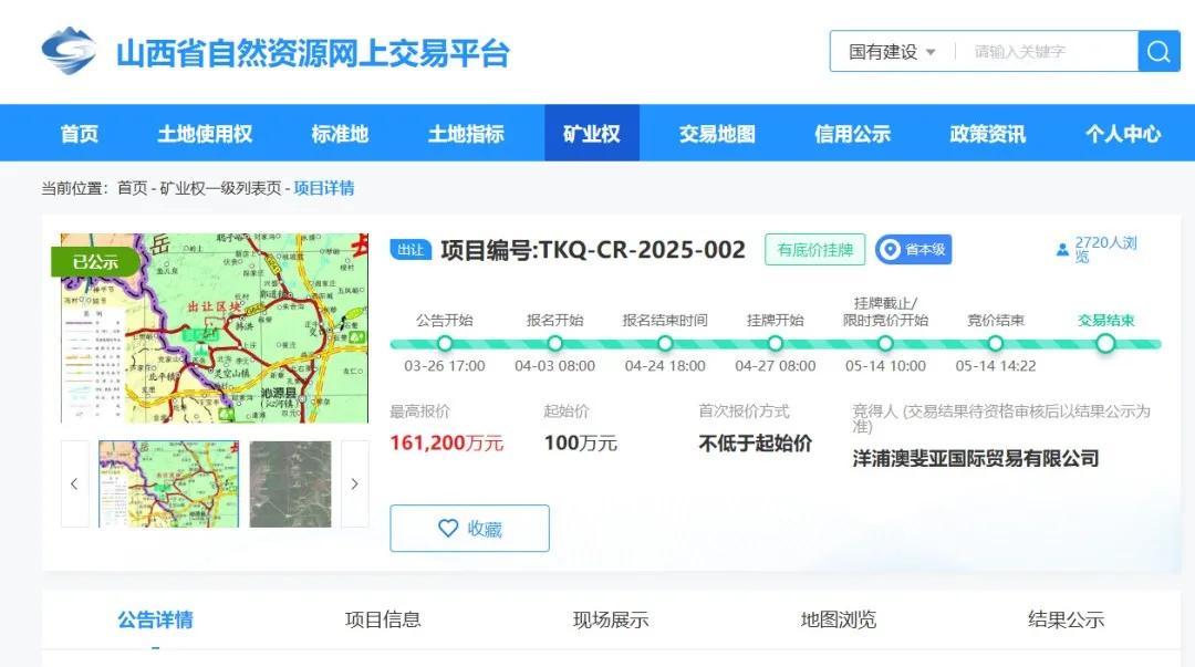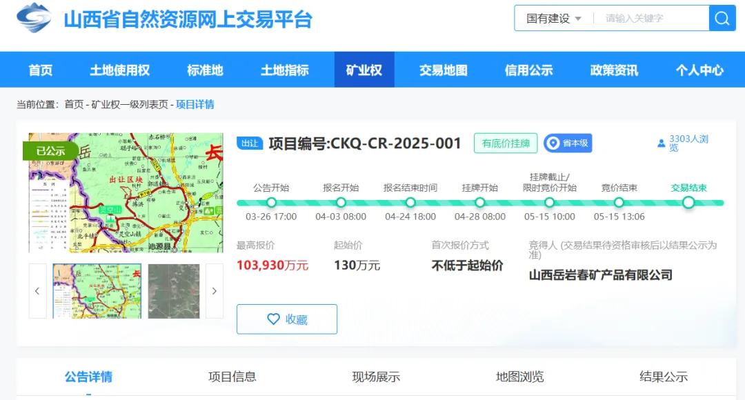 两个矿权分别是山西省沁源县正义区块铝土矿探矿权,以及山西省沁源县旋风窝区块铝土矿采矿权,两个矿权先后于4月27日和28日在山西省自然资源网上交易平台开始挂牌出让,前者起始价100万元,后者起始价130万元,最后均以超过10亿元的高价成交。