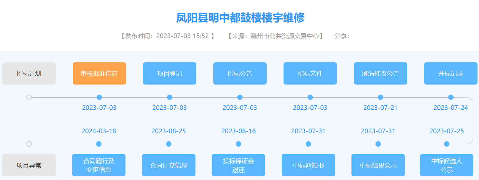 但是,澎湃新闻从滁州市公共资源交易中心查询到的时间点则显示,凤阳县发展和改革委员会批准《凤阳县明中都鼓楼楼宇维修》招标计划的时间为2023年7月3日。这份2023年7月3日发布的文件显示,招标单位为凤阳大明旅游发展(集团)有限公司,监管单位为凤阳县发改委。