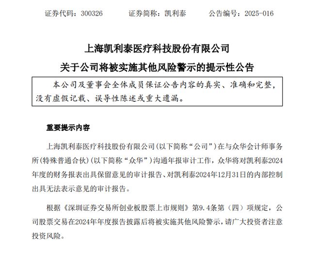 在4月30日披露的年报中,审计机构众华会计师事务所对凯利泰2024年年报出具了保留意见的审计报告、对凯利泰2024年12月31日的内部控制出具无法表示意见的审计报告。凯利泰因此被实施其他风险警示,简称变更为“ST凯利”。