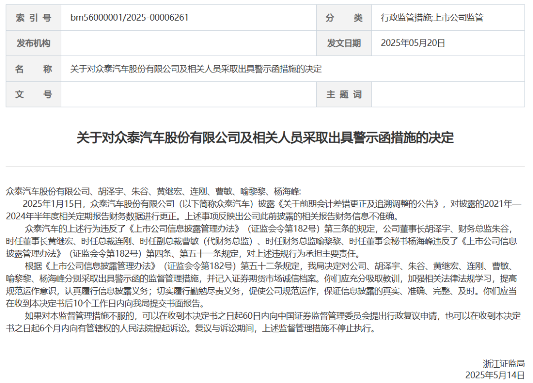 5月20日,浙江证监局发布关于对众泰汽车股份有限公司及相关人员采取出具警示函措施的决定。