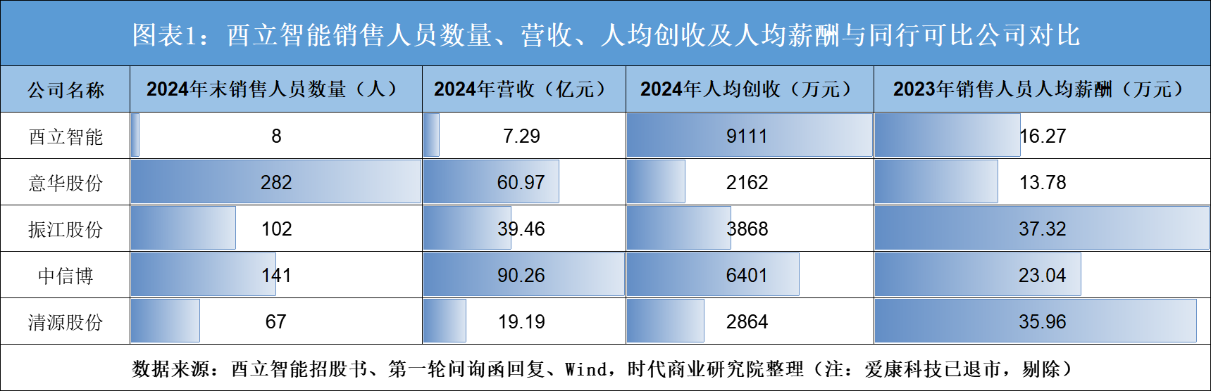 根据Wind数据测算,如图表1所示,2024年,意华股份、振江股份、中信博、清源股份的销售人员人均创收分别为2162万元、3868万元、6401万元、2864万元,远低于酉立智能。