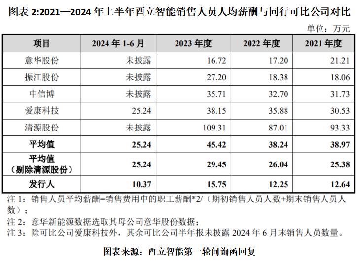 第一轮问询函回复显示,2021—2024年,酉立智能销售人员平均薪酬分别为12.64万元、12.25万元、15.75万元、19.22万元,而2021—2024年上半年,同行可比公司销售人员薪酬均值分别为38.97万元、38.24万元、45.42万元、25.24万元(注:2024年上半年仅爱康科技一家披露),剔除薪酬偏高的清源股份后,同行可比公司均值仍分别达到25.38万元、26.04万元、29.45万元、25.24万元,大部分约为酉立智能的两倍。