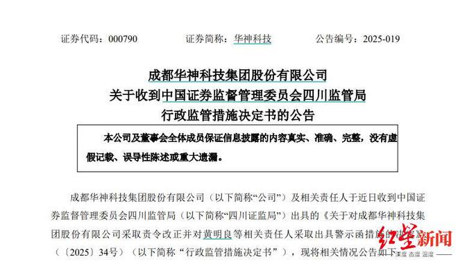 四川证监局指出,上述行为违反了《上市公司信息披露管理办法》相关规定,决定对华神科技采取责令改正的行政监管措施,并记入证券期货市场诚信档案。