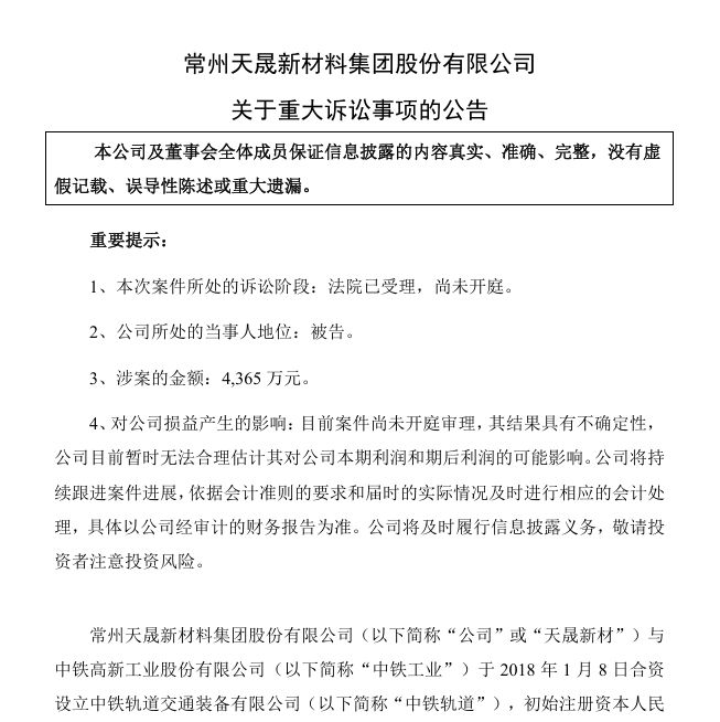 中铁轨道认为,天晟新材应承担的4500万元第一期增资款仅缴纳135万元,尚余4365万元未足额实缴到位,因此对公司提起诉讼。