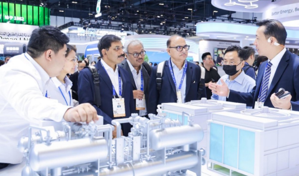 国外客商参观中燃展台,图为中燃自主研发的闭式热源塔泵