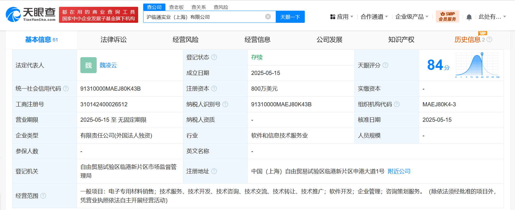 天眼查App显示,近日,沪临通实业(上海)有限公司成立,法定代表人为魏凌云,注册资本800万美元,经营范围为电子专用材料销售,技术服务、技术开发、技术咨询、技术交流、技术转让、技术推广,软件开发,企业管理,咨询策划服务。股东信息显示,该公司由中芯国际旗下中芯集电投资(上海)有限公司全资持股。