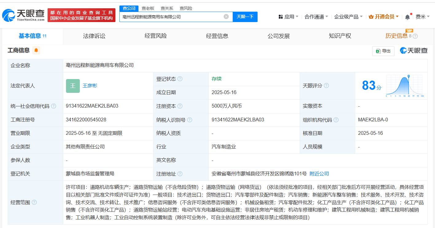 天眼查App显示,近日,亳州远程新能源商用车有限公司成立,法定代表人为王彦彬,注册资本5000万人民币,经营范围包括道路机动车辆生产、汽车零部件及配件制造、汽车销售、新能源汽车整车销售、信息咨询服务、机械设备租赁等,由浙江吉利远程新能源商用车集团有限公司、蒙城县开发区兴蒙投资有限公司、亳州交通投资控股集团有限公司共同持股。