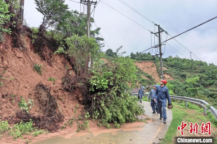 5月18日,因道路受阻,南方电网广西玉林北流供电局工作人员沿着受灾线路进行勘查。佘晟 摄
