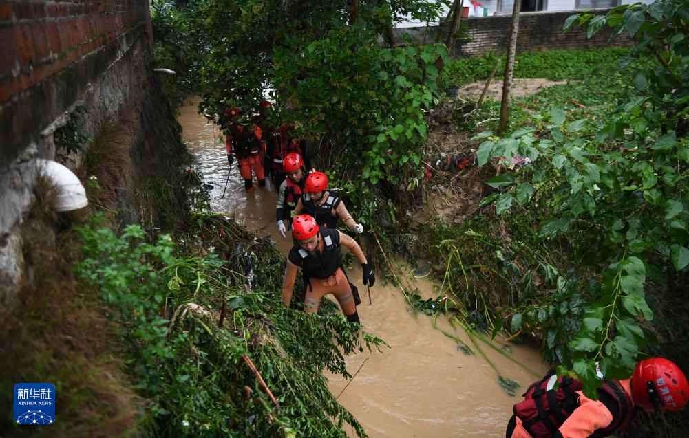 5月19日,在广东茂名高州市荷花镇平头岗村,应急救援人员在事故现场附近河道里搜救。新华社记者 邓华 摄