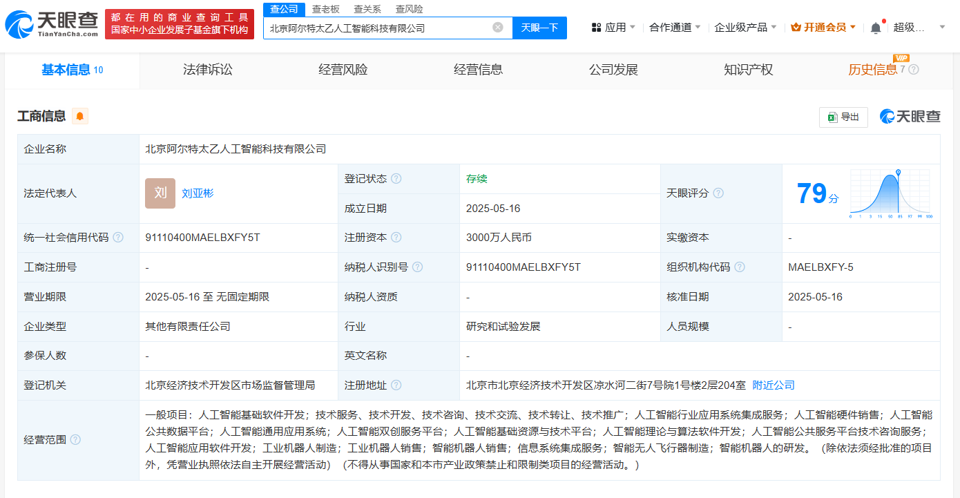 天眼查App显示,近日,北京阿尔特太乙人工智能科技有限公司成立,法定代表人为刘亚彬,注册资本3000万人民币,经营范围包括人工智能基础软件开发、人工智能硬件销售、人工智能公共数据平台、人工智能通用应用系统等。股东信息显示,该公司由阿尔特汽车技术股份有限公司、北京英伟特达科技有限合伙企业(有限合伙)、北京经济技术开发区种子投资基金(有限合伙)共同持股。