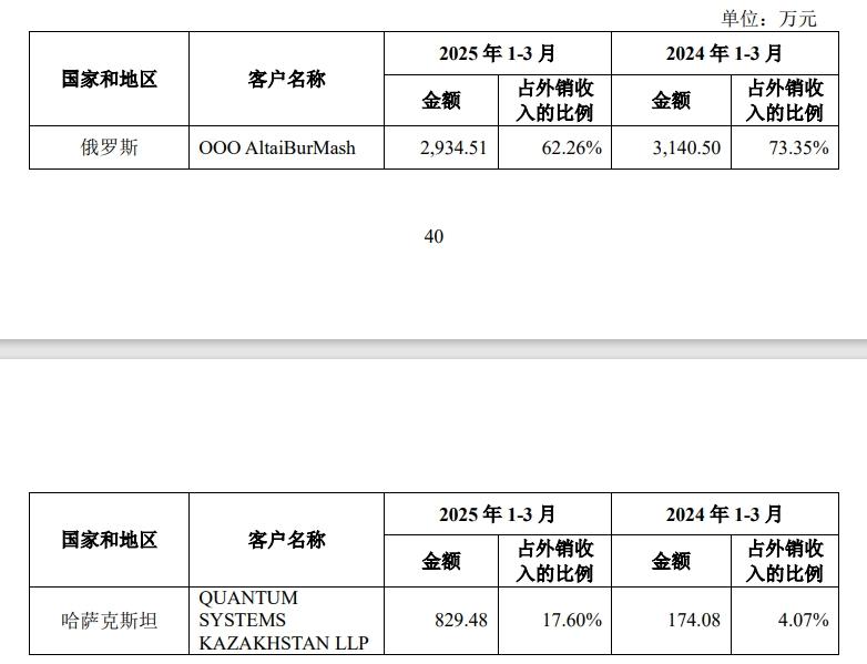报告期内,公司外销客户以俄罗斯 OOO AltaiBurMash、沙特阿拉伯 BIN HARKIL CO.LTD 和哈萨克斯坦 QUANTUM SYSTEMS KAZAKHSTAN LLP 为主,上述三家境外客户贡献收入金额占公司外销收入金额的比例分别为 95.40%、 88.32%和 84.91%。BIN HARKIL CO.LTD 于 2025 年1~3 月贡献收入金额为 24.71 万元、金额很小。俄罗斯及哈萨克斯坦地区客户于 2025 年 1~3 月的贡献收入金额具体如下: