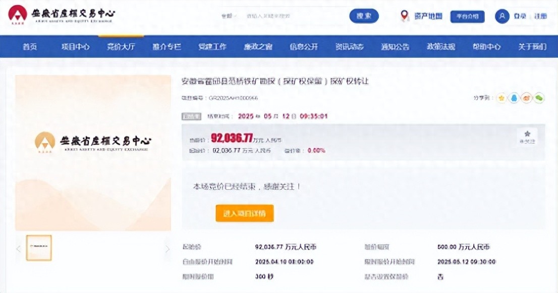 该矿权原由霍邱县利民城乡建设投资有限公司持有,2025年4月10日开始在安徽省产权交易中心以网上挂牌方式公开出让,转让底价92036.77万元,探矿权期限为2024年4月3日至2026年2月24日。5月12日,金安矿业以92036.77万元人民币竞得范桥铁矿探矿权,无溢价。