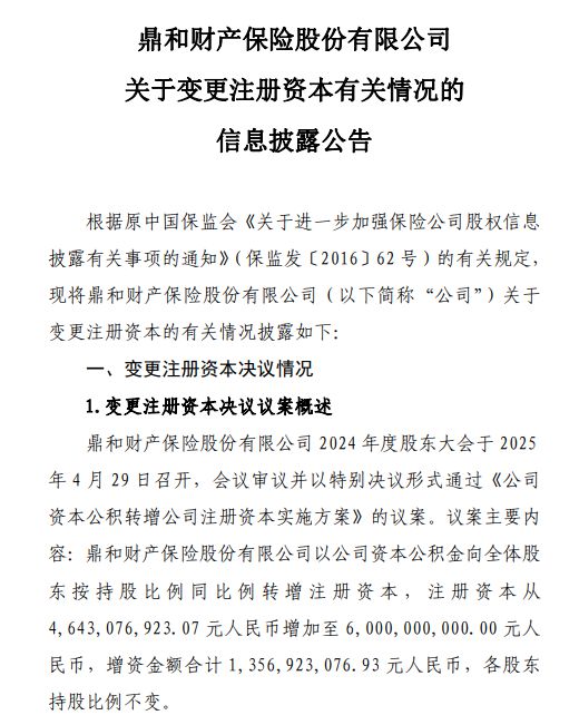5月16日,《国际金融报》记者注意到,鼎和财险日前发布公告称,公司以资本公积金向全体股东按持股比例同比例转增注册资本,注册资本从46.43亿元增加至60亿元,增资金额合计13.57亿元,各股东持股比例不变。上述增资事项需经监管核准后生效。