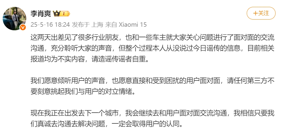 5月16日,小米汽车副总裁李肖爽在其个人微博回应称:这两天出差见了很多行业朋友,也和一些车主就大家关心问题进行了面对面的交流沟通,充分聆听大家的声音,但整个过程本人从没说过今日谣传的信息,目前相关报道均为不实内容,请造谣传谣者自重。