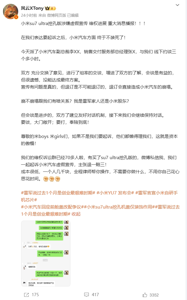 “风云XTony”在文中透露目前维权诉讼群已吸纳70余名车主,计划联合起诉小米汽车虚假宣传主张“退一赔三”。