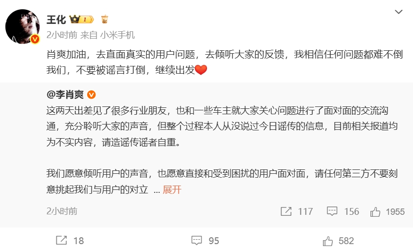 小米公关负责人王化转发表示:“肖爽加油,去直面真实的用户问题,去倾听大家的反馈,我相信任何问题都难不倒我们,不要被谣言打倒,继续出发”。