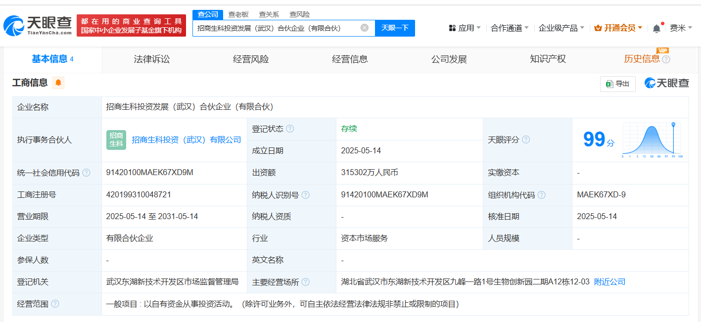 天眼查App显示,近日,招商生科投资发展(武汉)合伙企业(有限合伙)成立,执行事务合伙人为招商生科投资(武汉)有限公司,出资额约31.5亿人民币,经营范围为以自有资金从事投资活动。股权全景穿透图显示,该合伙企业由招商局创新科技(集团)有限公司旗下招商生命科技(武汉)有限公司、招商生科投资(武汉)有限公司、武汉市时语企业管理有限公司共同出资。