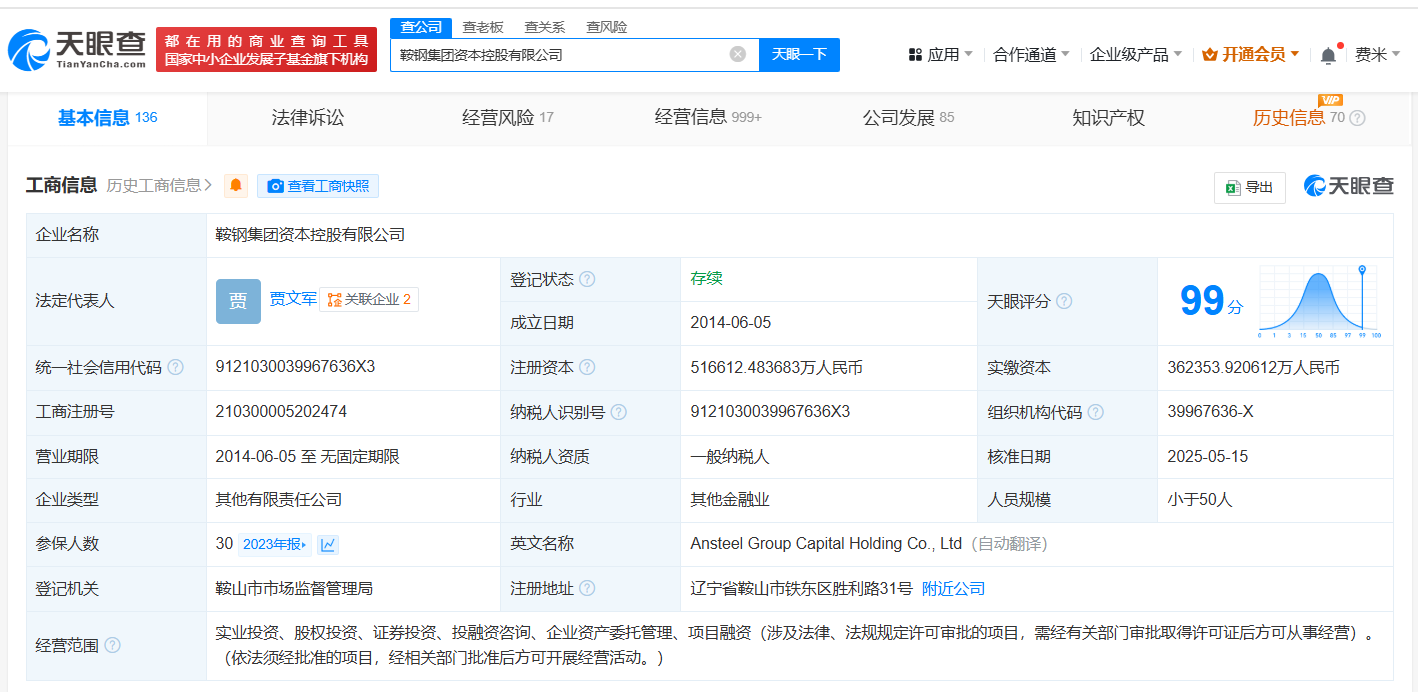 天眼查App显示,近日,鞍钢集团资本控股有限公司发生工商变更,新增鞍山钢铁集团有限公司为股东,注册资本由约36.2亿人民币增至约51.7亿人民币,增幅约43%,同时多位高管发生变更。