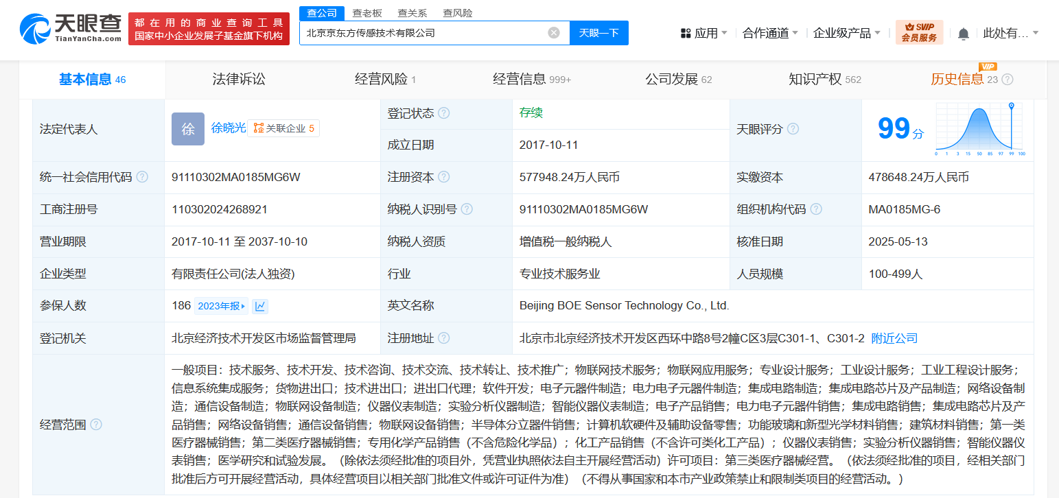 天眼查App显示,近日,北京京东方传感技术有限公司发生工商变更,注册资本由约47.86亿人民币增至约57.79亿人民币,同时,部分主要人员也发生变更。