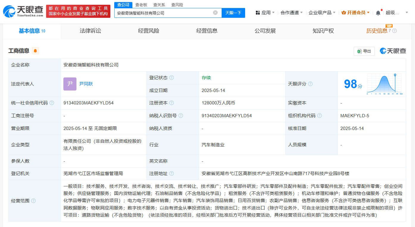 天眼查App显示,近日,安徽奇瑞智能科技有限公司成立,法定代表人为尹同跃,注册资本12.8亿人民币,经营范围包括汽车零部件研发、汽车零部件及配件制造、汽车零配件批发、供应链管理服务等。股东信息显示,该公司由奇瑞控股集团有限公司全资持股。