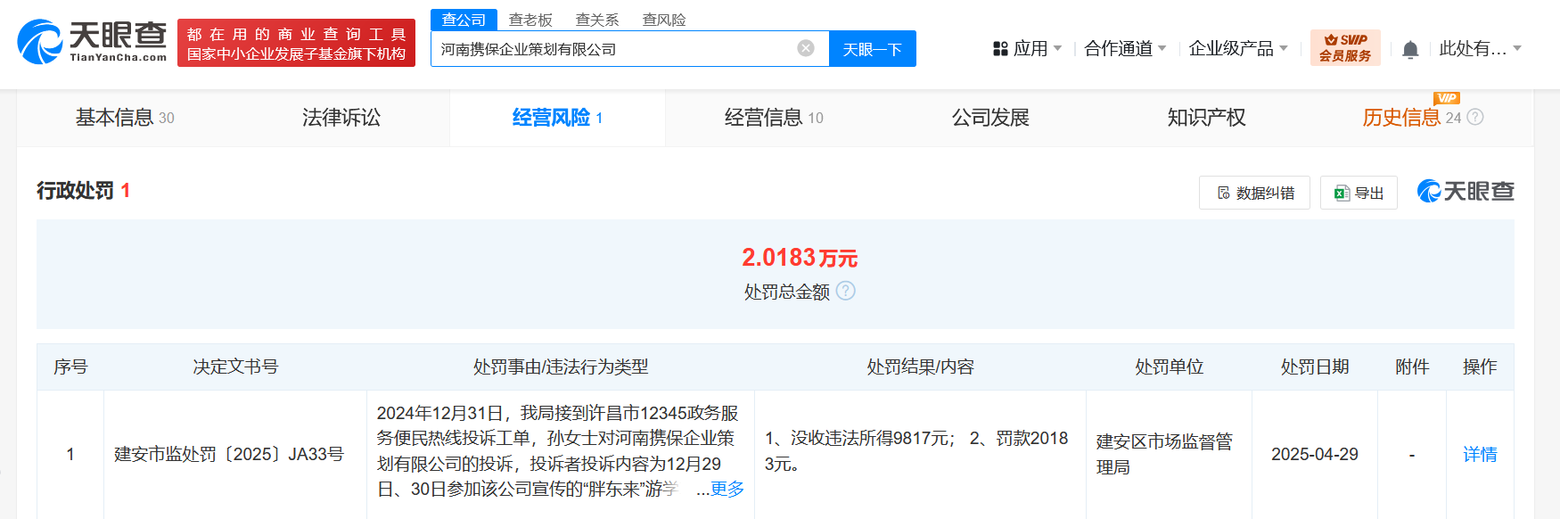 处罚事由显示,河南携保企业策划有限公司于2024年11月25日以“豫见胖东来-研学之旅”名义宣传收费1599元/人的游学项目,经查实:该公司与胖东来无任何授权及合作关系;授课人员非胖东来在职员工,无零售经验且未使用正规课件;胖东来公司已出具声明与该活动无关。