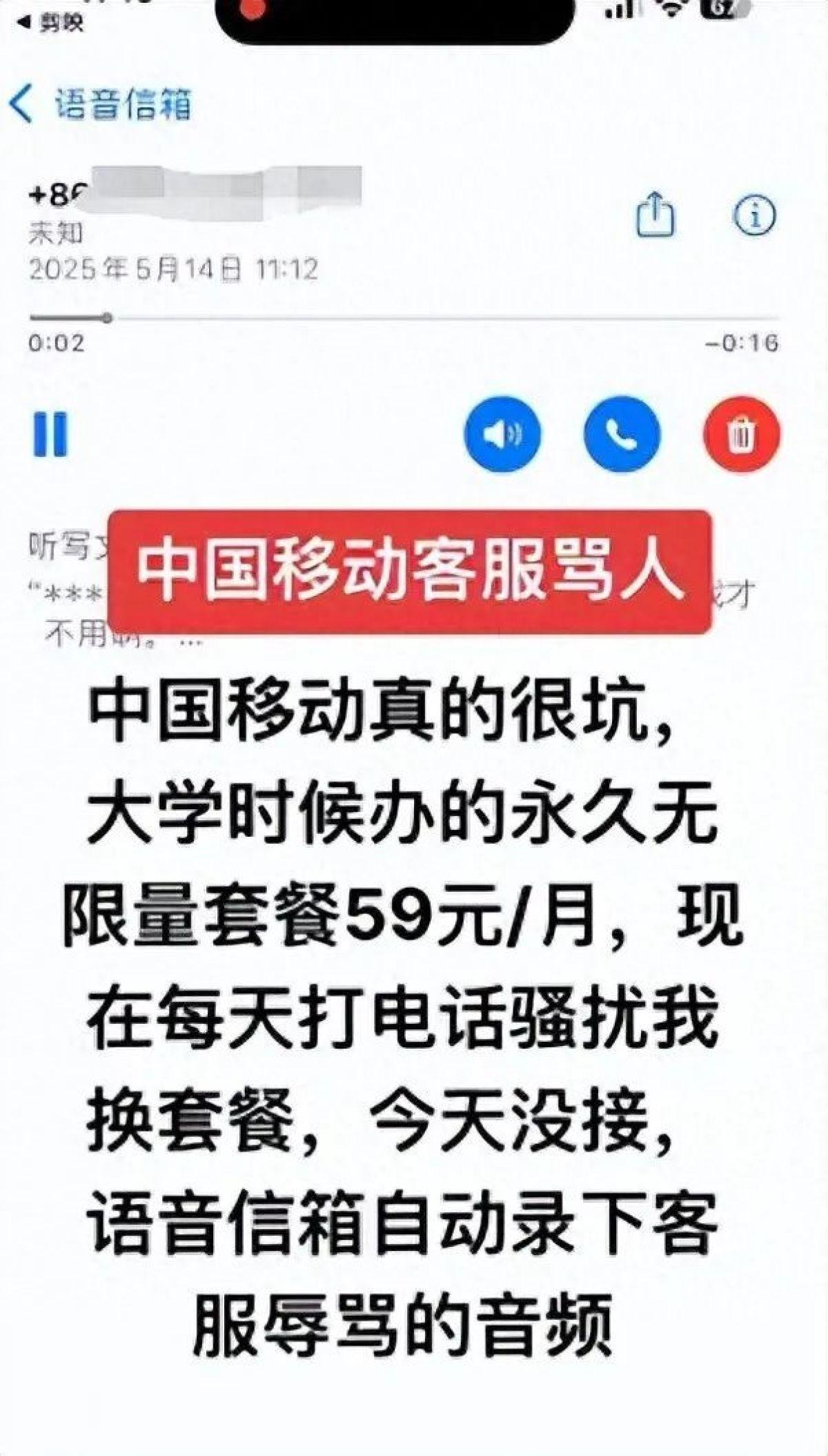 5月14日,一福建IP的网友反映,中国移动的工作人员多次联系她更换“无限流量套餐”被拒,后她在手机语音留言中听到,自己被对方辱骂“穷X才用无限流量”。