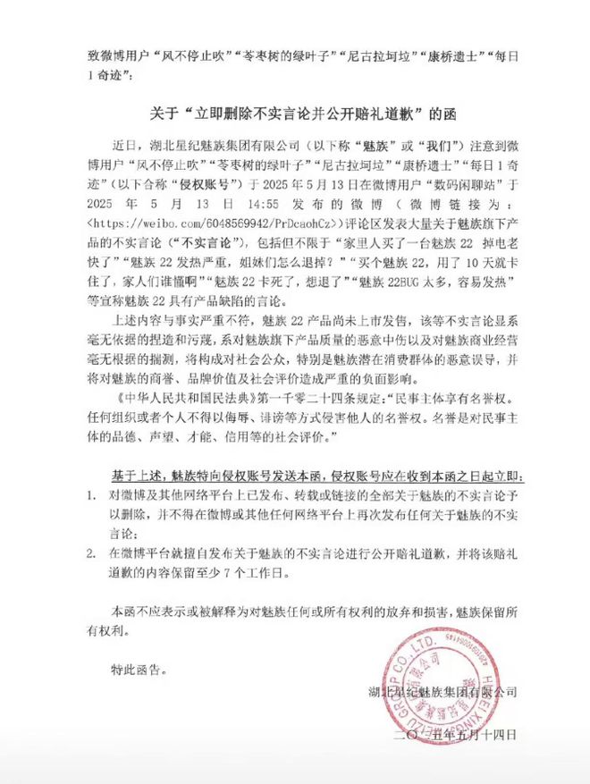 其中,魅族就发布“魅族22产品缺陷”的五名微博用户删除相关言论并赔礼道歉。