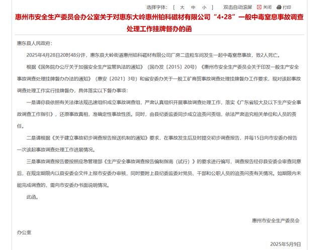 5月15日,《每日经济新闻》记者注意到,惠州市人民政府官网刊发了《惠州市安全生产委员会办公室关于对惠东大岭惠州铂科磁材有限公司“4·28”一般中毒窒息事故调查处理工作挂牌督办的函》(以下简称“挂牌督办函”),上述函件称2025年4月28日20时48分许,惠东县大岭街道惠州铂科磁材有限公司(以下简称铂科磁材)厂房二造粒车间发生一起中毒窒息事故,致2人死亡。惠州市安全生产委员会根据相关文件的要求,对该起事故调查处理工作实行挂牌督办,要求惠东县人民政府落实相关督办事项。