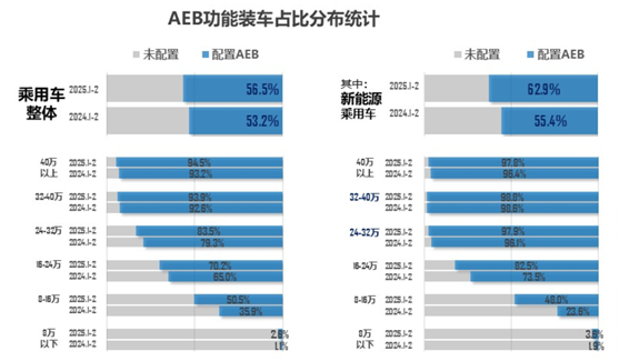根据佐思数据,2024年1—8月,我国AEBS整体渗透率在60%左右。乘联分会发布的2025年2月汽车智能网联洞察报告显示,今年1—2月AEBS整体装配率表现良好,乘用车整体装配率为56.5%,其中新能源乘用车装配率相对较高,已经达到62.9%。