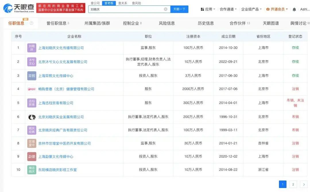 天眼查显示,刘晓庆名下关联10家企业,7家为吊注销状态,仅3家公司存续,行业均涉及文化、体育和娱乐业。其担任被指控的上海弈熙文化传媒中心投资人角色,该公司为个人独资企业,成立于2017年6月,出资额3万元。年报信息显示,该公司多年0人参保。