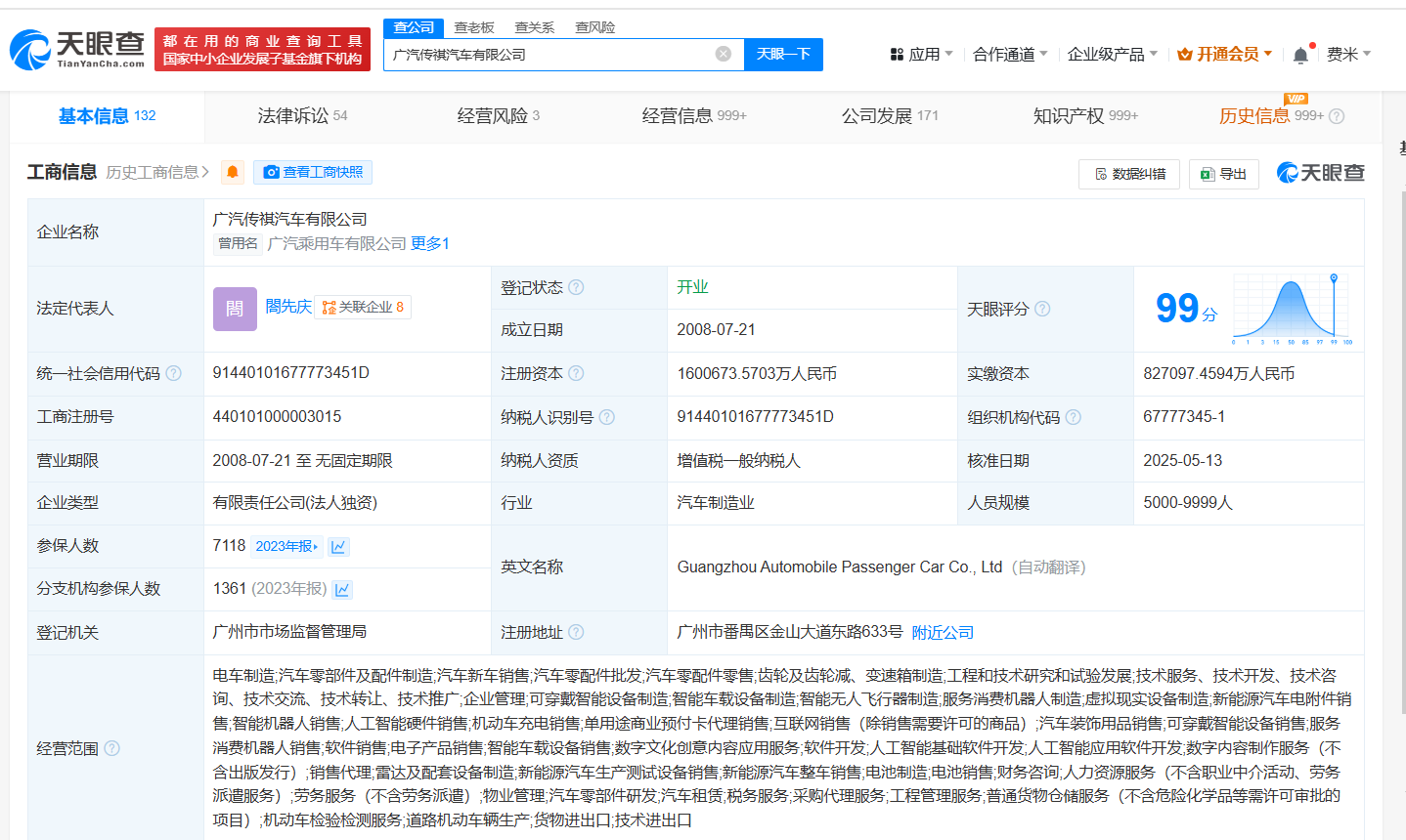 该公司成立于2008年7月,注册资本约160.1亿人民币,经营范围包括电车制造、汽车零部件及配件制造、汽车新车销售、汽车零配件批发、汽车零配件零售、企业管理等,由广汽集团(601238)全资持股。