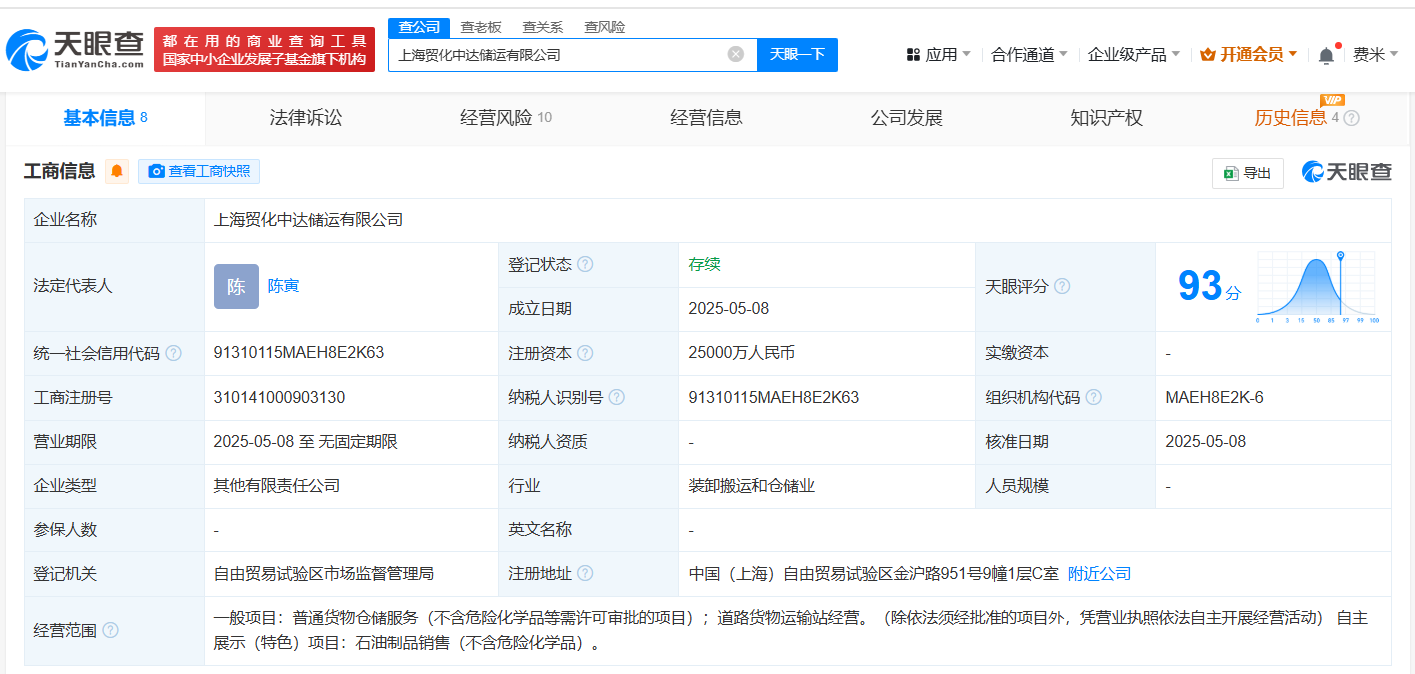 天眼查App显示,近日,上海贸化中达储运有限公司成立,法定代表人为陈寅,注册资本2.5亿人民币,经营范围包括普通货物仓储服务、道路货物运输站经营、石油制品销售,由中国对外经济贸易信托有限公司、上海中宝盛达储运有限公司共同持股。