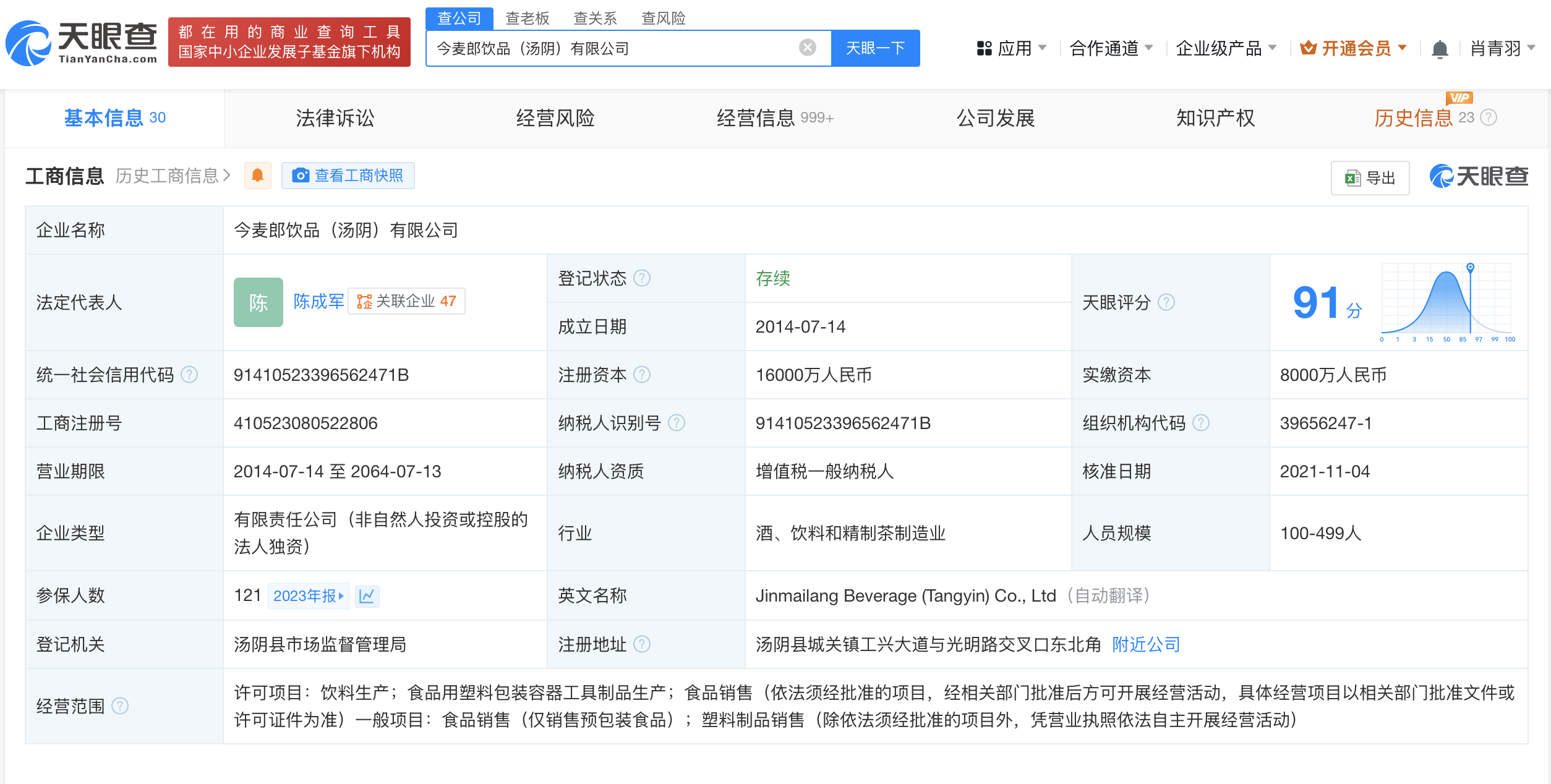 天眼查App显示,今麦郎饮品(汤阴)有限公司成立于2014年7月,法定代表人为陈成军,注册资本1.6亿人民币,经营范围含饮料生产、食品用塑料包装容器工具制品生产、食品销售等,由今麦郎饮品股份有限公司全资持股。抽查检查信息显示,该公司多次被抽查检查,显示符合或未发现问题。食品安全信息显示,去年8月,该公司生产的娃哈哈饮用纯净水曾被抽检,抽检结果为合格。