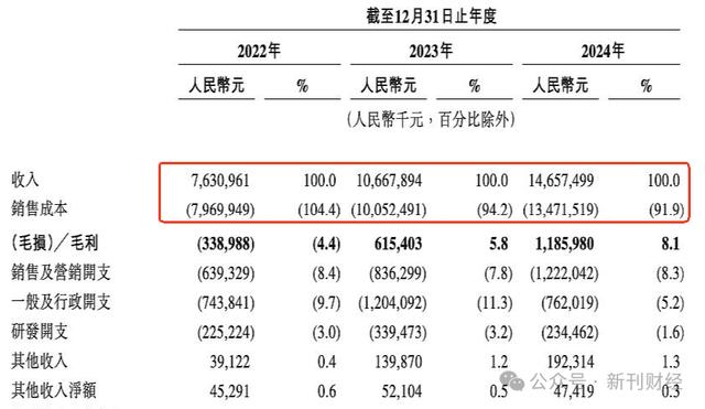 2022至2024年间,其营收从76.31亿元跃升至146.57亿元,看似描绘出一条令人振奋的增长曲线。然而这条光鲜的曲线背后,却潜伏着一个深不见底的财务漩涡——同期销售成本虽占比从104.44%降至91.9%,但绝对金额却膨胀至惊人的134.72亿元。