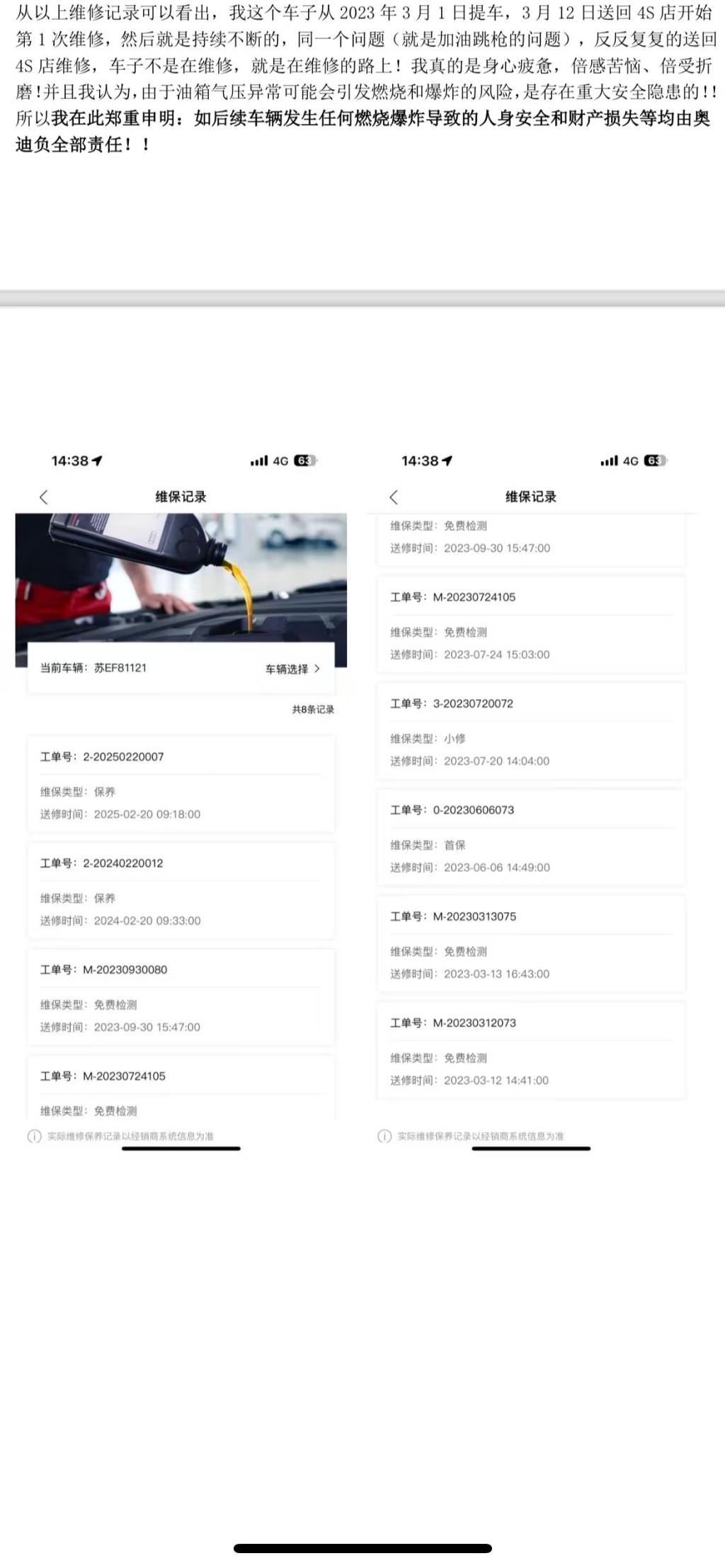 接到陈先生投诉后,澎湃新闻联系了苏州中迪奥迪4S店,相关负责人表示,陈先生的车辆实际维修记录仅为两次:2024年更换油箱、2025年3月更换排气阀,其余进店记录属“问题反馈”,不纳入维修范畴。