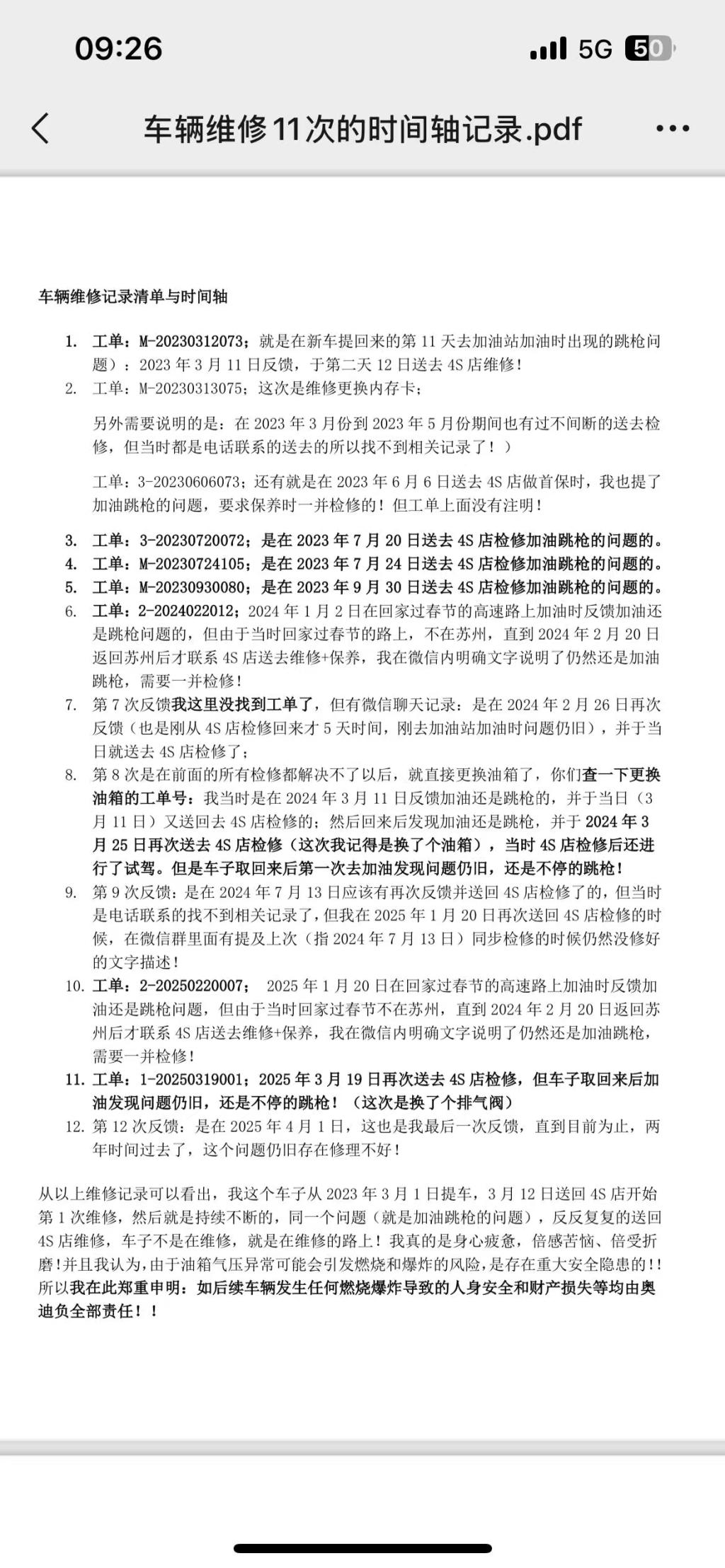 “每次加油都提心吊胆,加油站甚至不敢给我加满油,担心油箱气压过高引发燃烧或爆炸风险。”陈先生表示,由于他购买车型为油电混动,多数时间在使用电机行驶,但是偶尔需要加油时,仍会出现跳枪问题。为此,在过去的两年时间里,他曾多次前往4S店就此问题进行维修。陈先生提供的工单显示,自2023年3月至2025年3月两年时间内因“跳枪”问题向4S店报修11次,先后进行了9次检修,但油箱加油跳枪的问题始终得不到解决。