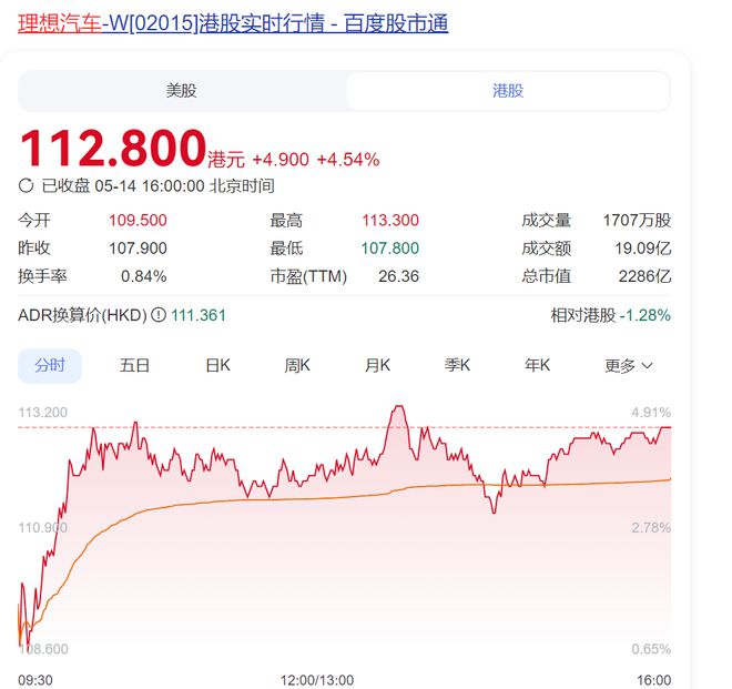 5月14日,理想汽车港股收涨4.54%,年内已涨超20%,总市值2286亿港元。