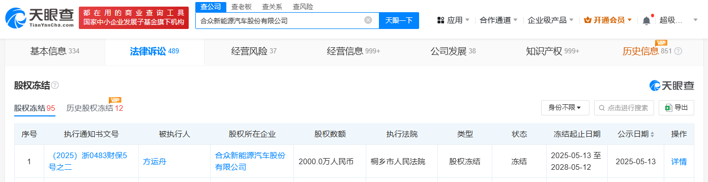 天眼查App显示,近日,合众新能源汽车股份有限公司新增股权冻结信息,被执行人为哪吒汽车创始人方运舟,冻结股权数额2000万人民币,冻结期限自2025年5月13日至2028年5月12日,执行法院为浙江省嘉兴市桐乡市人民法院。