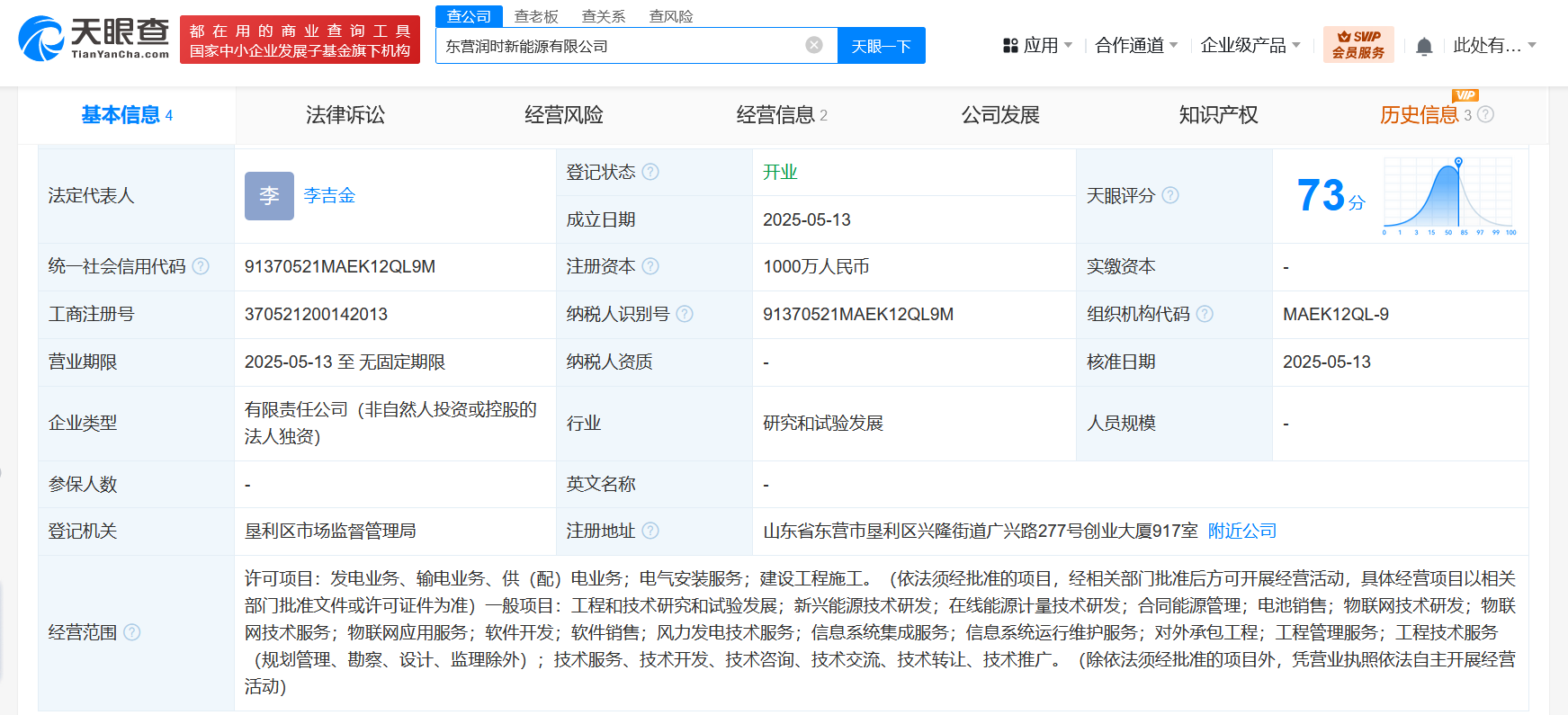 天眼查App显示,近日,东营润时新能源有限公司成立,法定代表人为李吉金,注册资本1000万人民币,经营范围含发电业务、输电业务、供(配)电业务,工程和技术研究和试验发展,新兴能源技术研发,在线能源计量技术研发,合同能源管理,物联网技术研发,物联网技术服务等。股权全景穿透图显示,该公司由时代绿色能源有限公司全资持股,后者为宁德时代(300750)全资子公司。