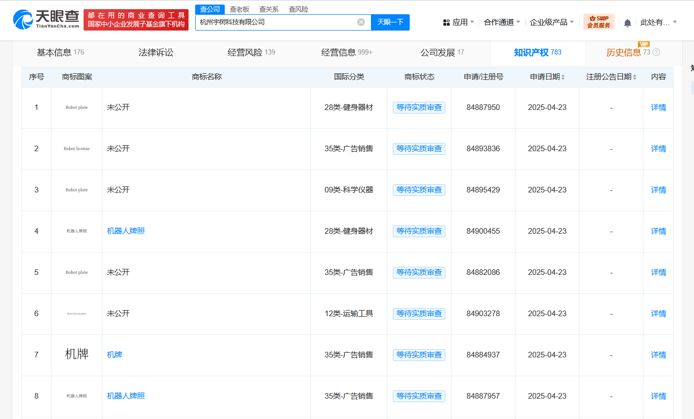 天眼查财产线索信息显示,近日,杭州宇树科技有限公司申请注册“机器人牌照”“机牌”“Robot license”“Robot plate”等商标,国际分类为科学仪器、运输工具、广告销售等,当前商标状态均为等待实质审查。