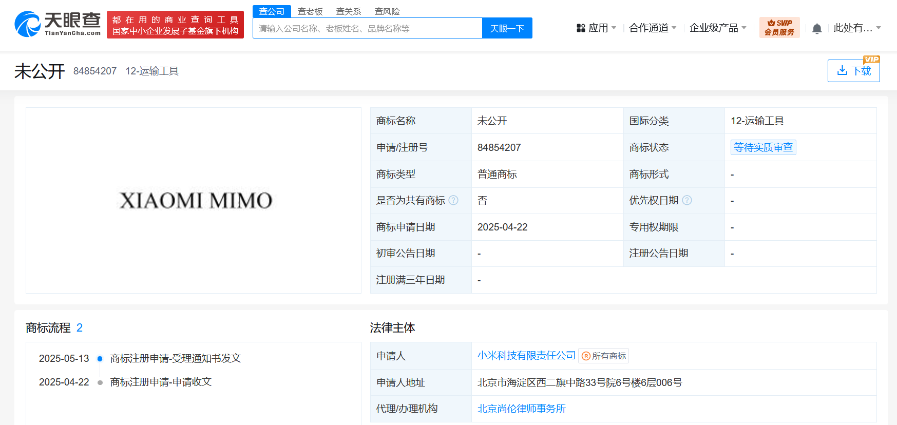 天眼查App显示,近日,小米科技有限责任公司申请注册多枚“XIAOMI MIMO”商标,国际分类为运输工具、科学仪器、通讯服务等,当前商标状态均为等待实质审查。