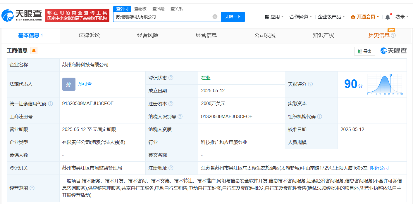 天眼查App显示,近日,苏州海骑科技有限公司成立,法定代表人为孙可青,注册资本2000万美元,经营范围包括网络与信息安全软件开发、信息技术咨询服务、社会经济咨询服务、共享自行车服务、电动自行车销售、电动自行车维修等,由美团旗下Xigua Limited全资持股。