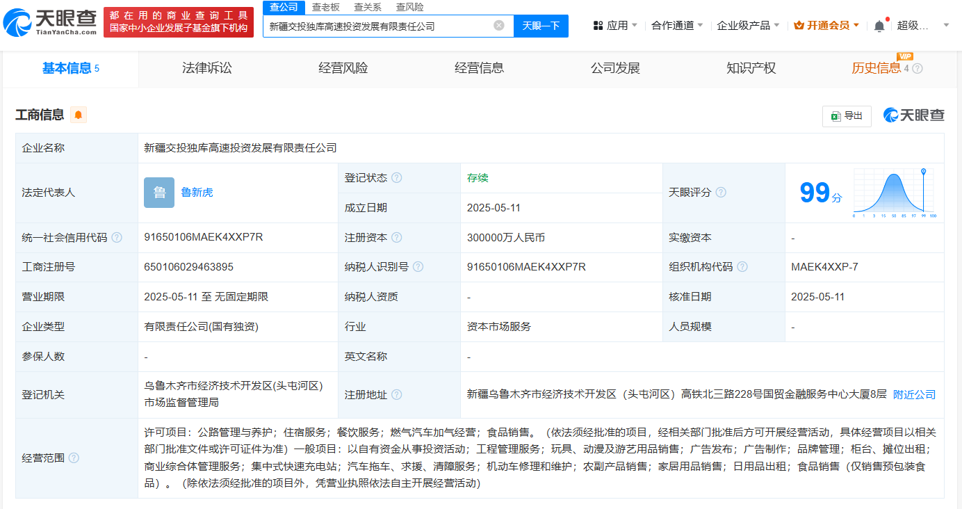 天眼查App显示,近日,新疆交投独库高速投资发展有限责任公司成立,法定代表人为鲁新虎,注册资本30亿人民币,经营范围包括以自有资金从事投资活动、工程管理服务、住宿服务、餐饮服务等。股东信息显示,该公司由新疆交通投资(集团)有限责任公司全资持股。