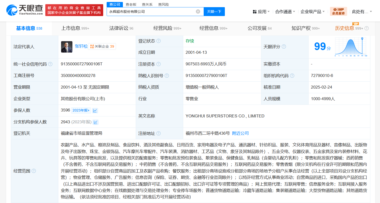 天眼查天眼风险信息显示,近日,永辉超市(601933)新增一则被执行人信息,执行标的39.08万余元,执行法院为福州市鼓楼区人民法院。