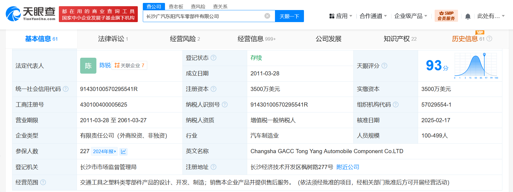 长沙广汽东阳汽车零部件有限公司成立于2011年3月,法定代表人为陈锐,注册资本3500万美元,经营范围为交通工具之塑料类零部件产品的设计、开发、制造,销售本企业产品并提供售后服务,由广汽零部件有限公司、Tong Yang Holding Corporation分别持股51%、49%。