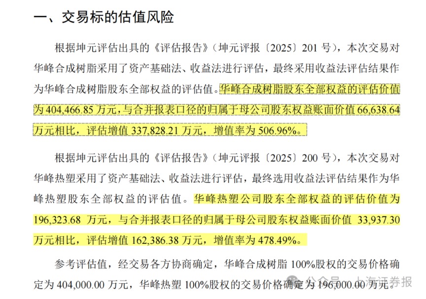 首先是收购标的的较高增值率引发质疑。根据公司发布的草案,华峰合成树脂股东全部权益的评估价值为40.45亿元,增值率为506.96%。华峰热塑公司股东全部权益的评估价值为19.63亿元,其增值率为478.49%。